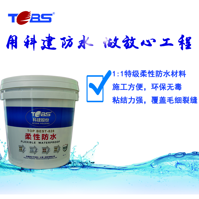 科建TOP BEST-828防水涂料是由雙組份高分子聚合物改性組成的一種柔性防水材料,使用一種粉料與液體添加劑相混合,涂上固化后,得到一種柔韌性的防水膜并與原先的混凝土及新的水泥砂漿都有良好的粘附力,能與之形成緊密牢固的結合體,還能抵抗一定范圍的裂縫。